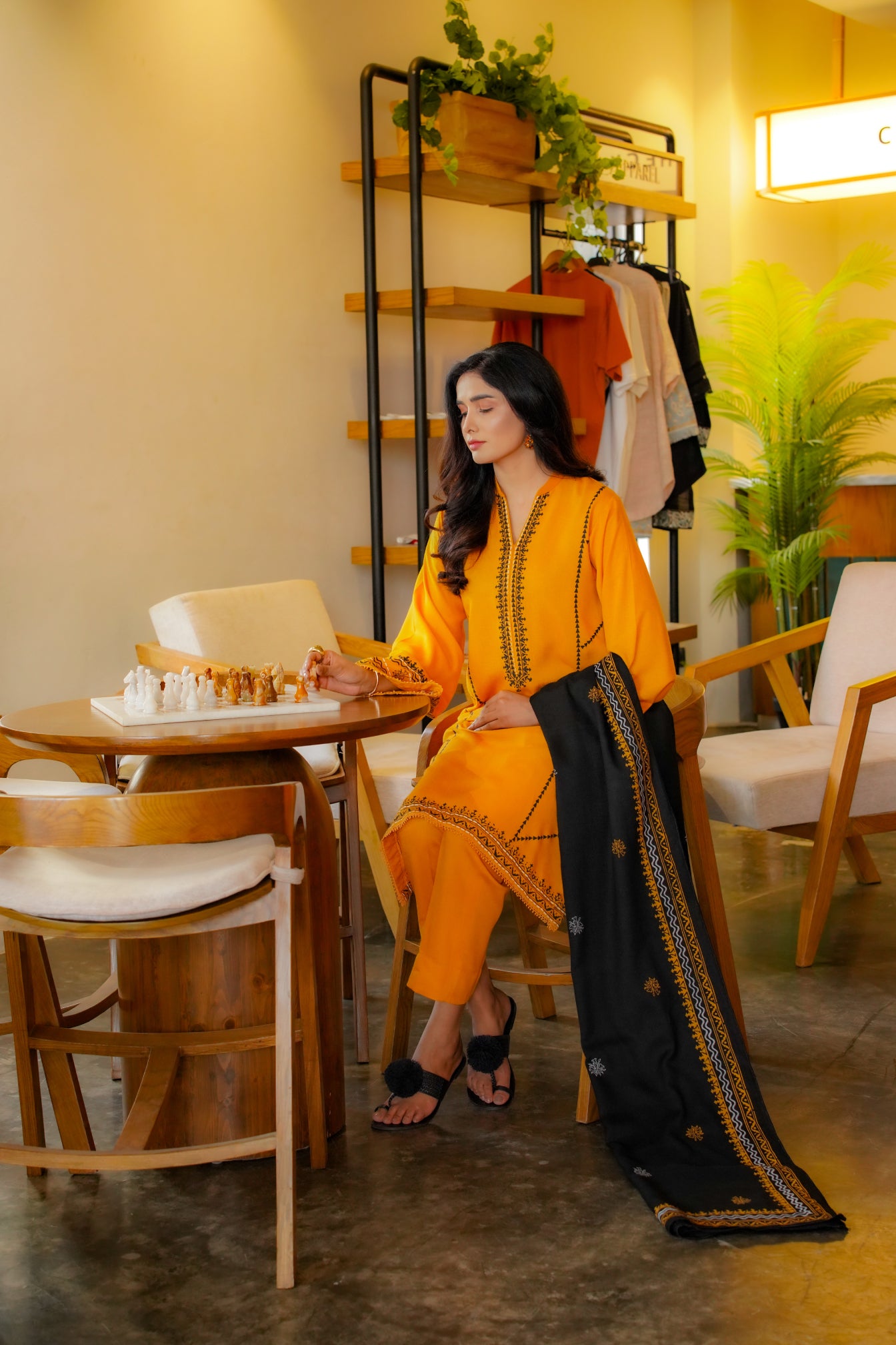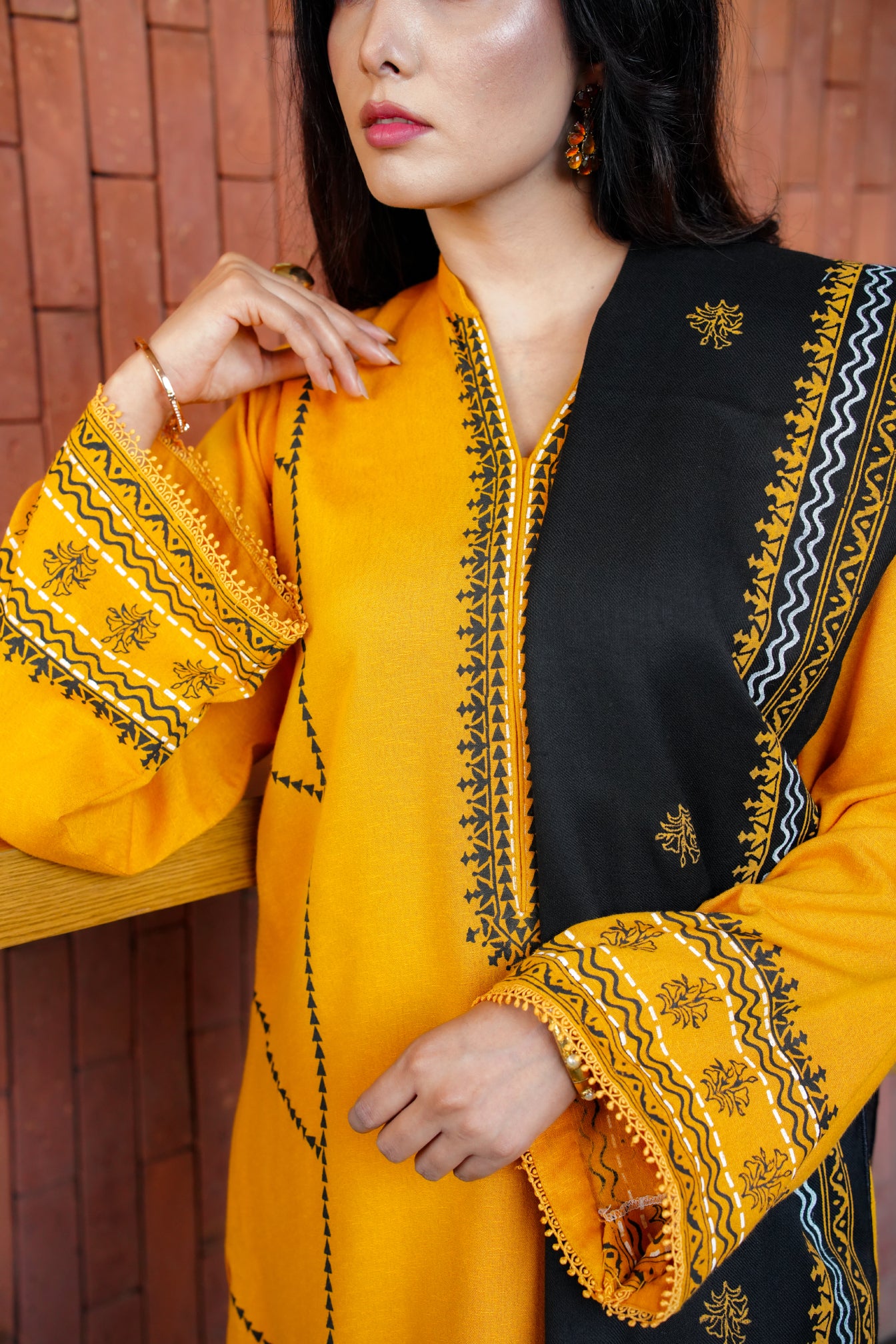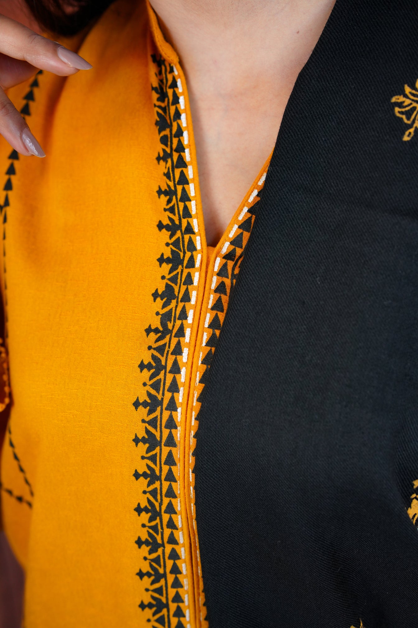 Paired with a black woolen based shawl adorned with intricately block-printed borders, this 3-piece set blends comfort and charm - perfect for serene winter mornings and cozy evening gatherings.