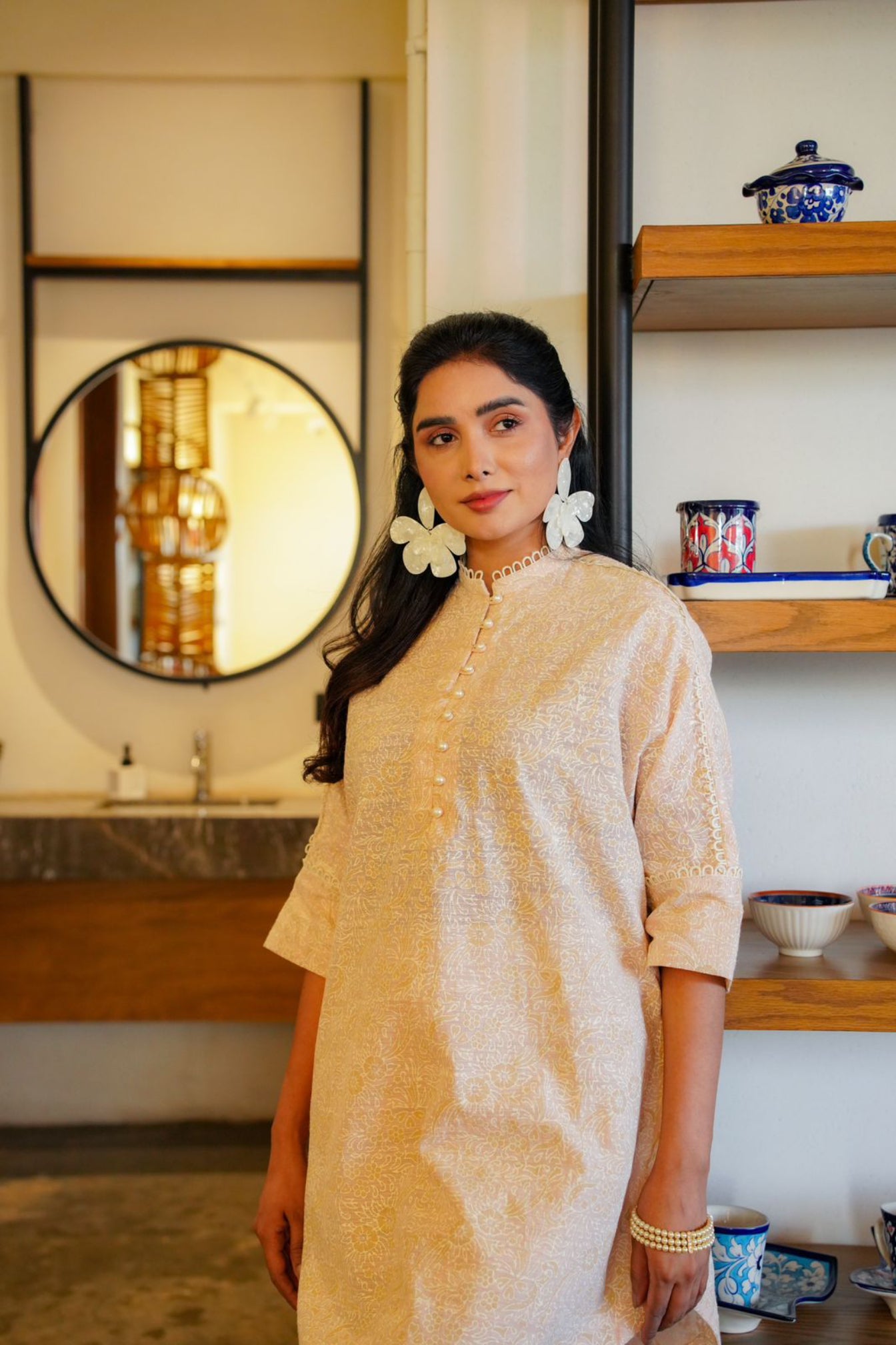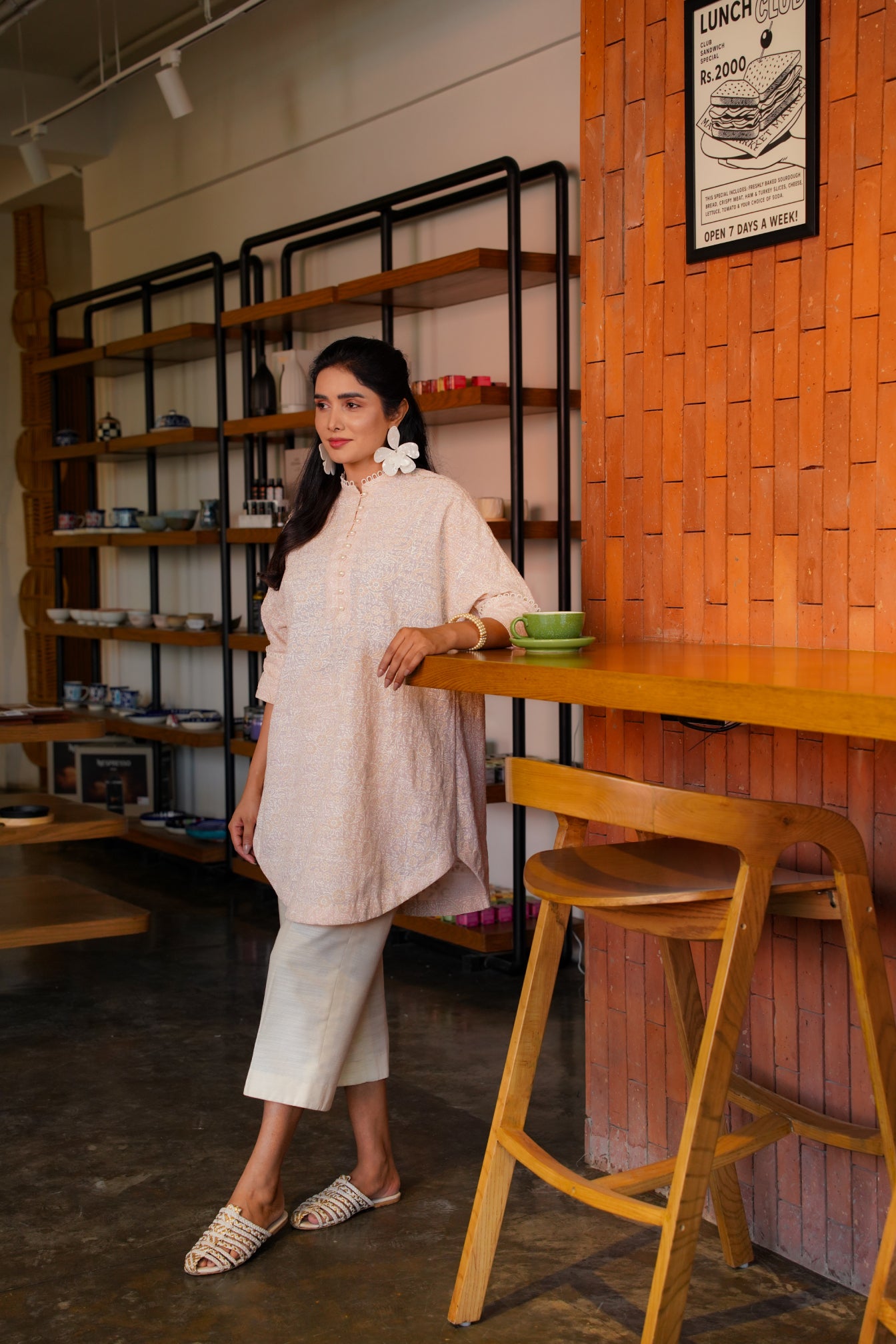 This khaddar boxy kurta with intricate lace detailing on the sleeves and collar is finished with delicate pearl buttons that lend a touch of quiet grace.